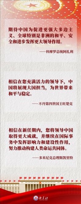 2023年3月10日,在十四屆全國人大一次會議第三次全體會議上,習近平同志全票當選為中華人民共和國主席、中華人民共和國中央軍事委員會主席。連日來,多國領(lǐng)導人和國際組織負責人紛紛致電致函,對習近平當選國家主席、中央軍委主席表示熱烈祝賀,表達對中國未來發(fā)展的信心,期盼中國繼續(xù)為人類和平與發(fā)展事業(yè)貢獻中國智慧、中國方案。