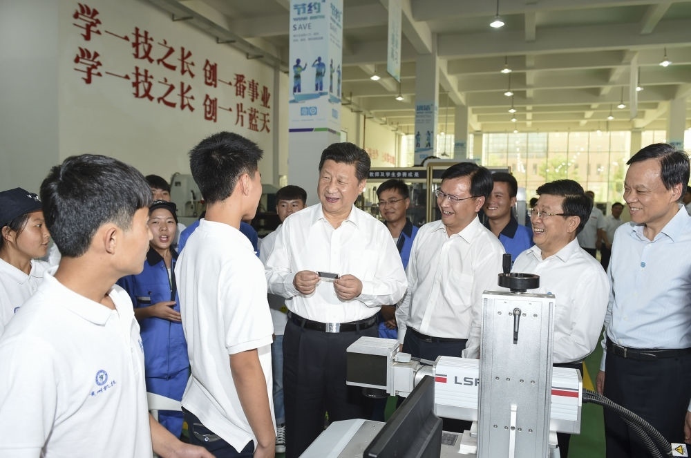 2015年6月17日,習(xí)近平在貴州省機械工業(yè)學(xué)校實訓(xùn)基地勉勵學(xué)生加強操作訓(xùn)練、不斷取得優(yōu)異成績。