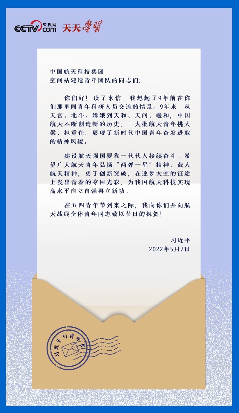 2022年5月2日,在五四青年節(jié)到來之際,中國航天科技集團(tuán)空間站建造青年團(tuán)隊收到了一份特別的節(jié)日禮物——一封落款為“習(xí)近平”的回信。