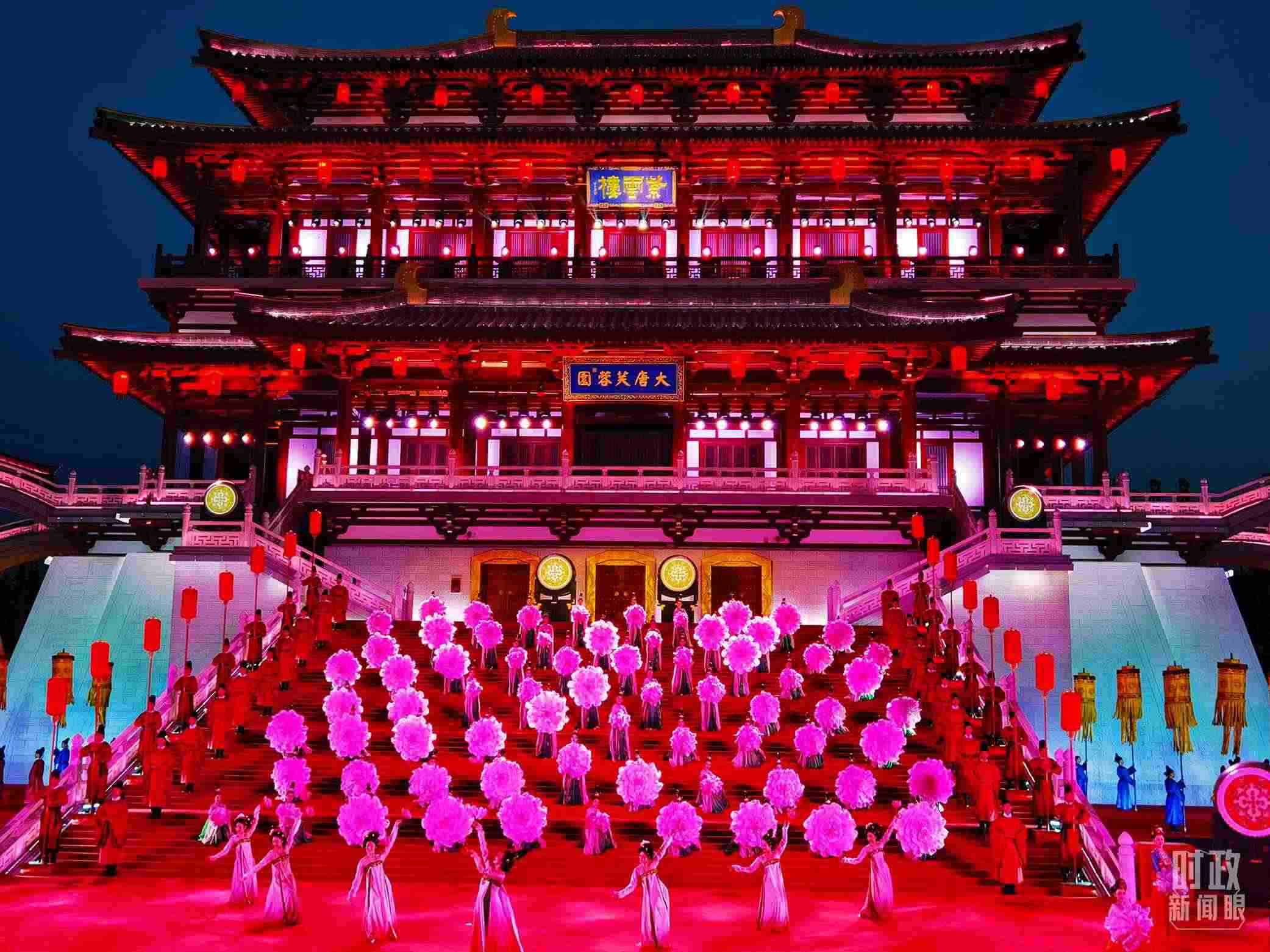紫云樓是大唐芙蓉園最主要的仿唐建筑群之一。18日晚的迎賓表演就是以紫云樓為背景。(總臺央視記者劉琦拍攝)