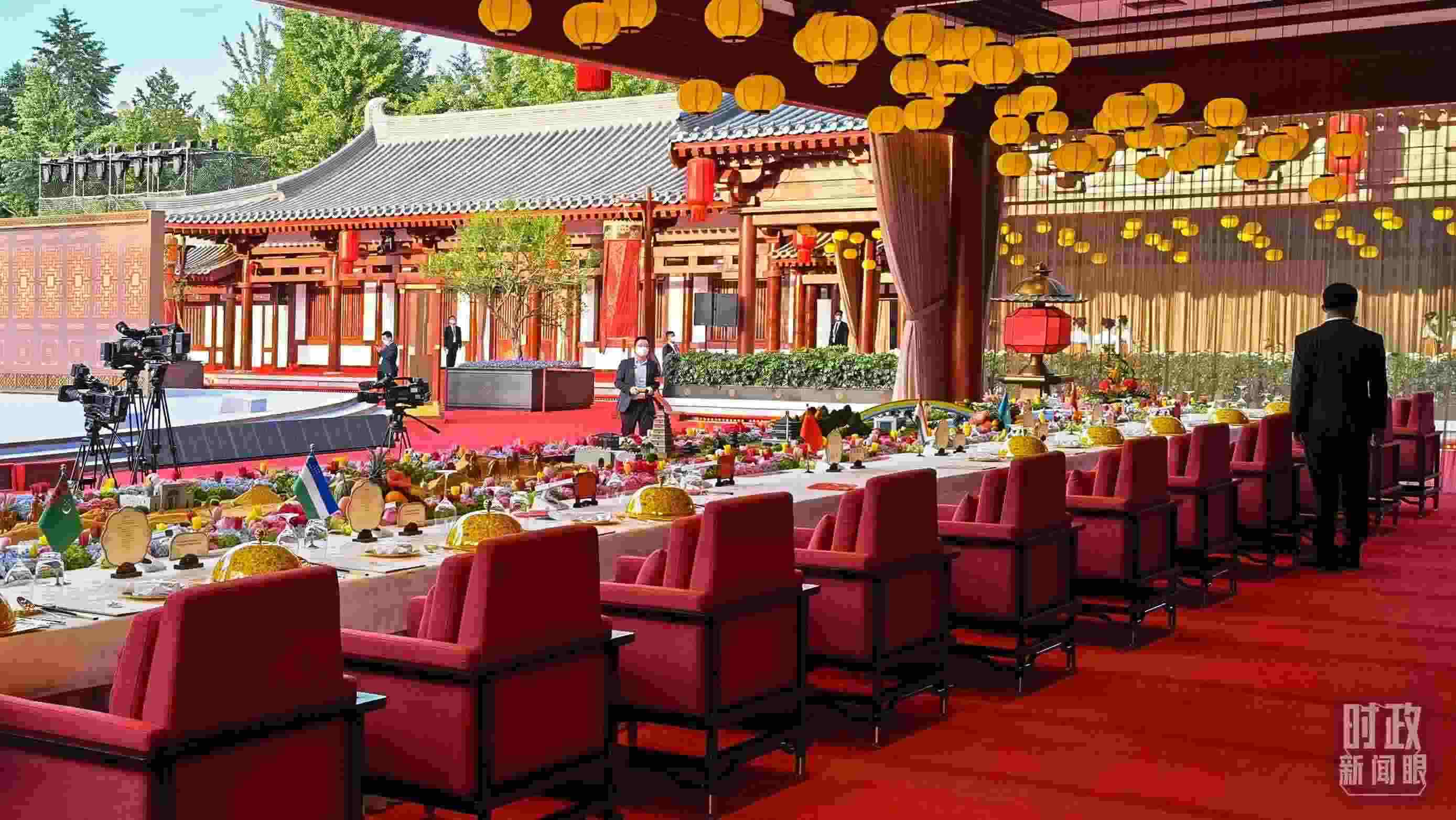 歡迎晚宴的餐臺設計融入古絲綢之路和“一帶一路”元素,并穿插中國和中亞五國的標志性建筑,獨具匠心。(總臺央視記者石丞拍攝)