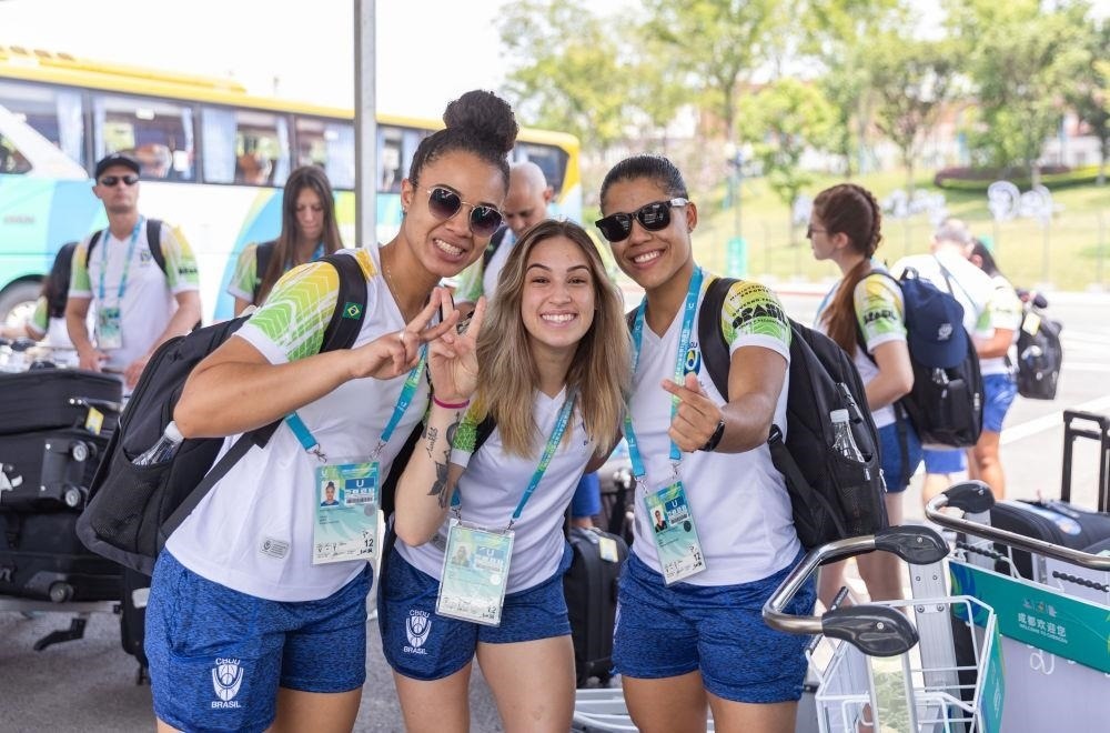 △2023年7月22日,巴西代表團成員抵達中國四川成都大運村后合影。