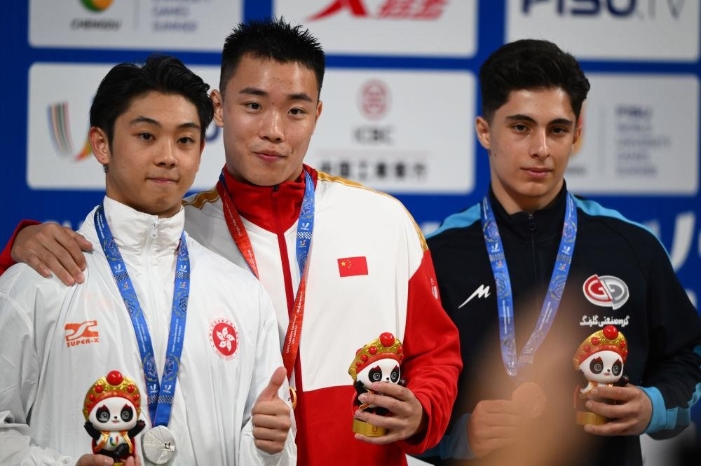 △2023年7月29日,成都大運會武術(shù)項目男子南拳冠軍中國隊選手曹茂園(中)、亞軍中國香港隊選手劉子龍(左)和季軍伊朗隊選手巴尼塔勒比在頒獎儀式上。