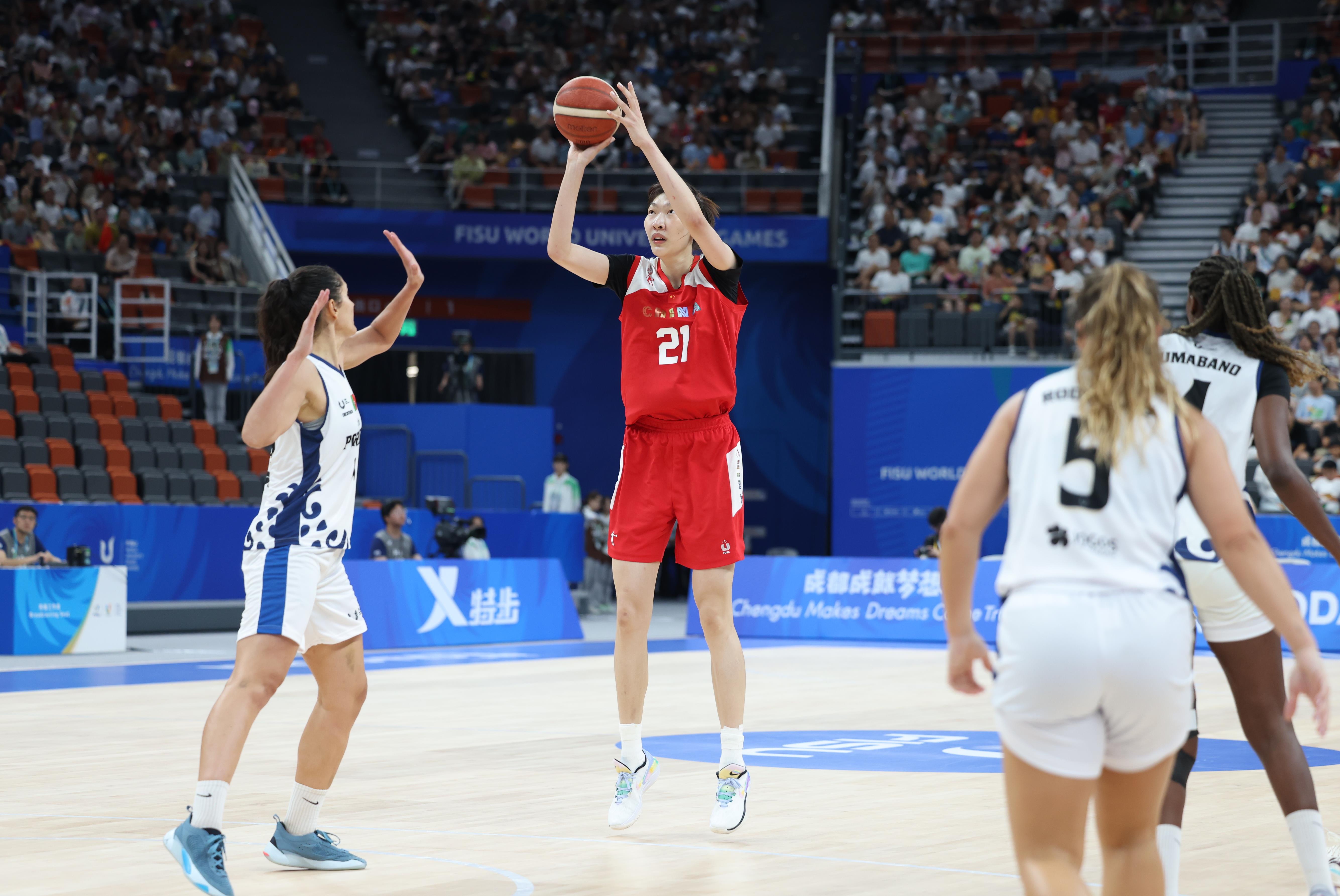 △2023年7月28日,在成都大運會女籃小組賽中,中國大學(xué)生女籃戰(zhàn)勝葡萄牙大學(xué)生女籃。