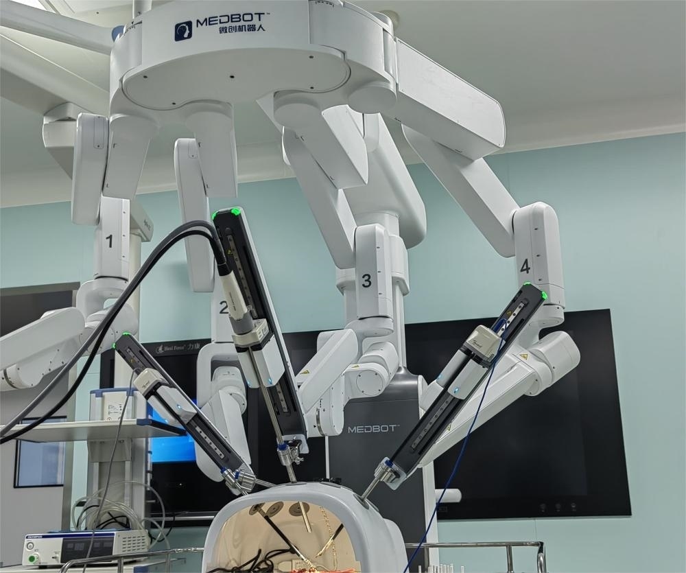 這是實施5G+AI超遠程微創(chuàng)手術的四臂腔鏡機器人。(受訪者供圖)