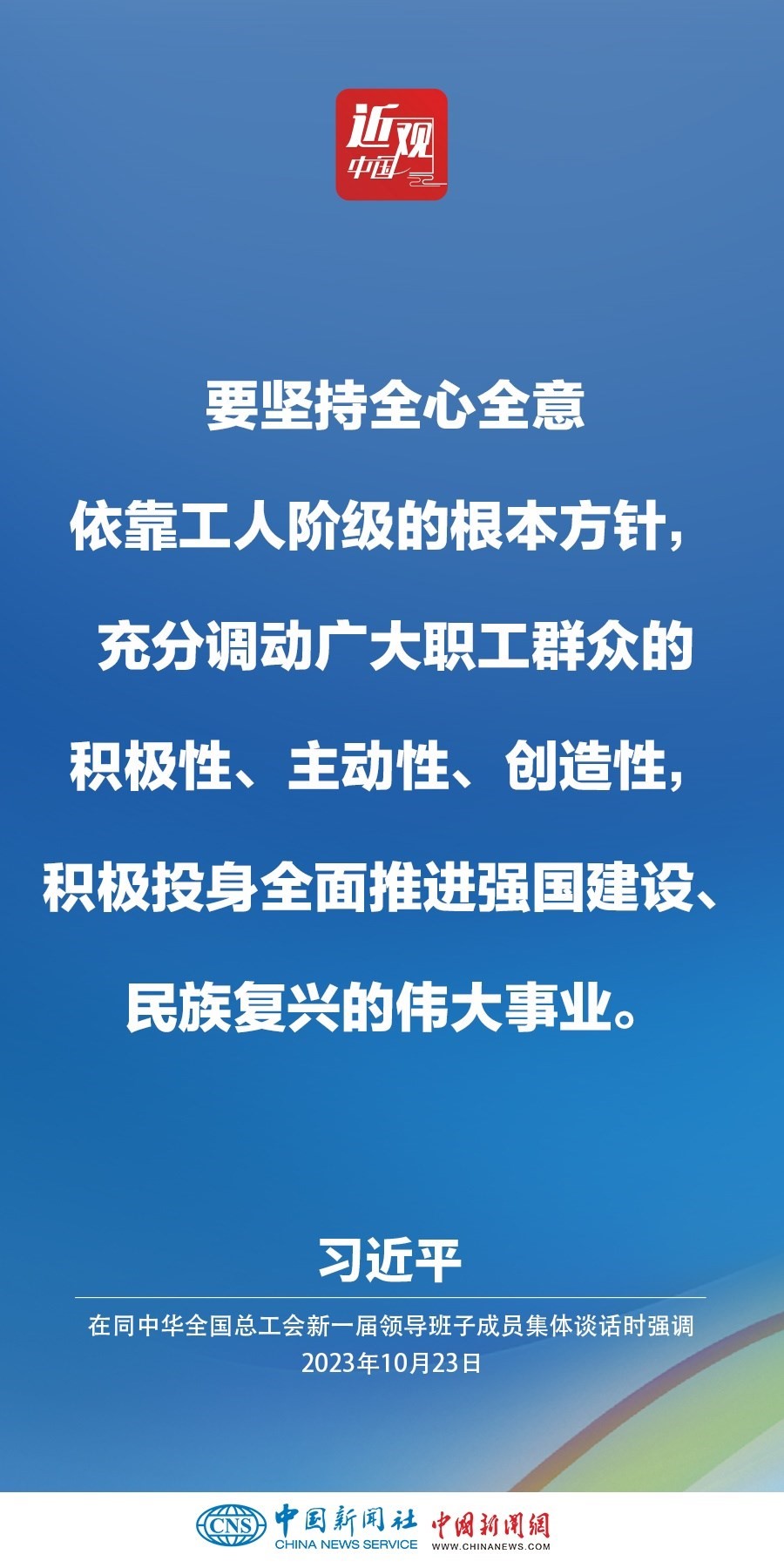 中共中央總書記、國家主席、中央軍委主席習(xí)近平23日下午在中南海同中華全國總工會新一屆領(lǐng)導(dǎo)班子成員集體談話并發(fā)表重要講話。他強調(diào)——
