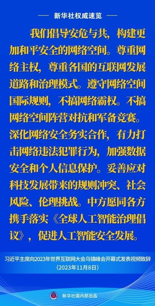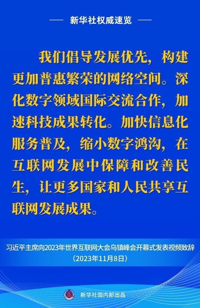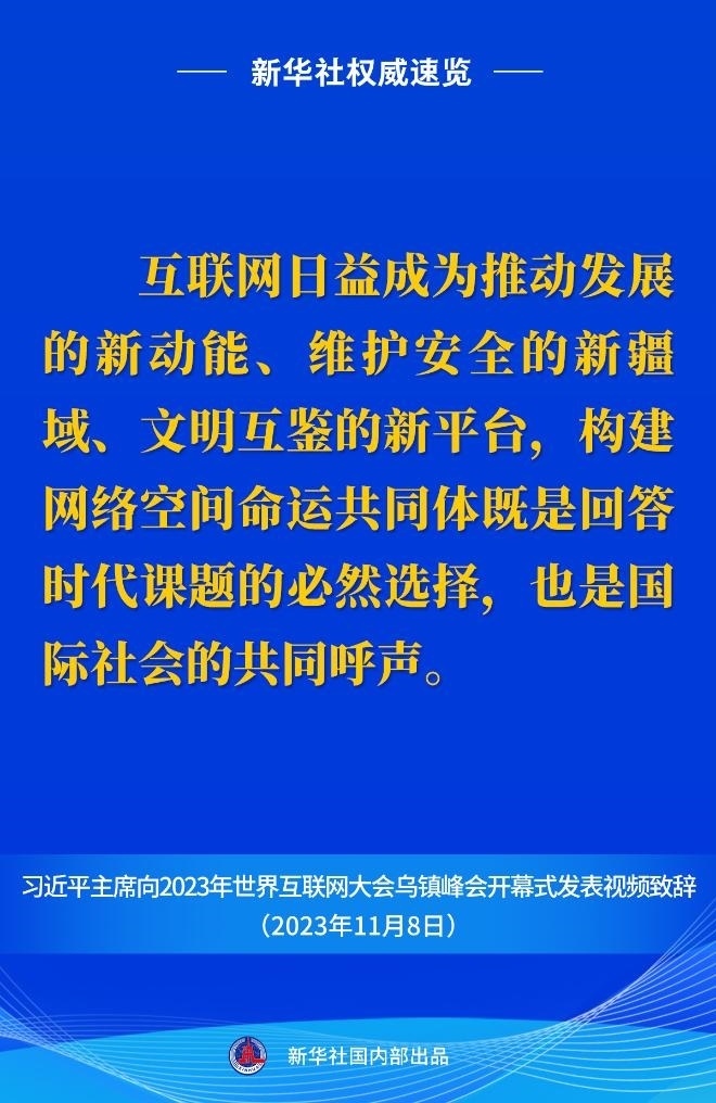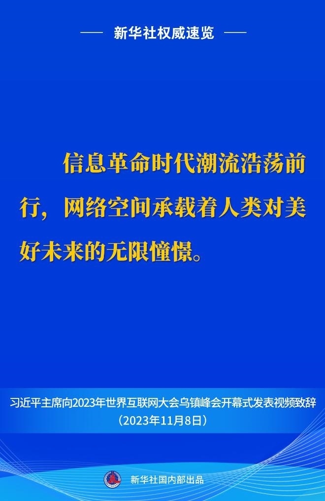 11月8日上午,國(guó)家主席習(xí)近平向2023年世界互聯(lián)網(wǎng)大會(huì)烏鎮(zhèn)峰會(huì)開幕式發(fā)表視頻致辭。一起來看金句。