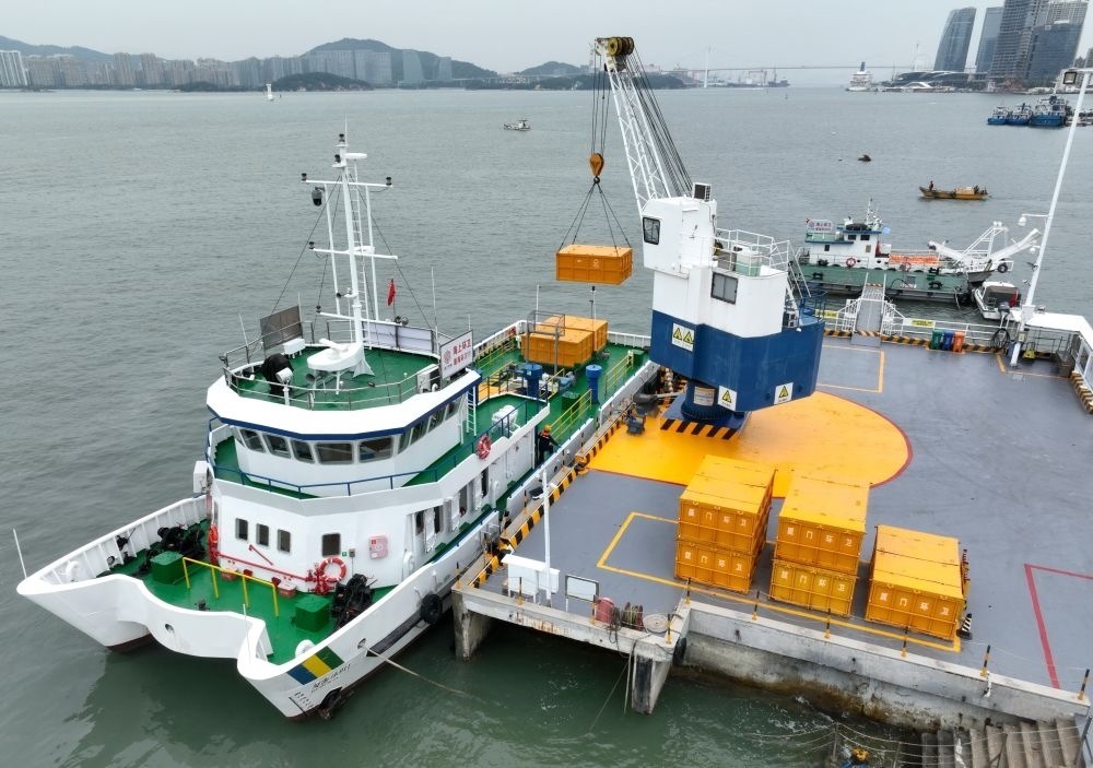 2024年1月25日,工作人員在廈門西堤海上環(huán)衛(wèi)碼頭吊運(yùn)海漂垃圾(無(wú)人機(jī)照片)。新華社記者 林善傳 攝
