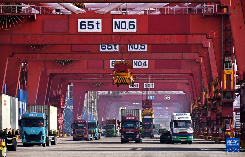 ??2024年2月11日,卡車在青島港集裝箱碼頭裝運集裝箱。新華社記者 李紫恒 攝