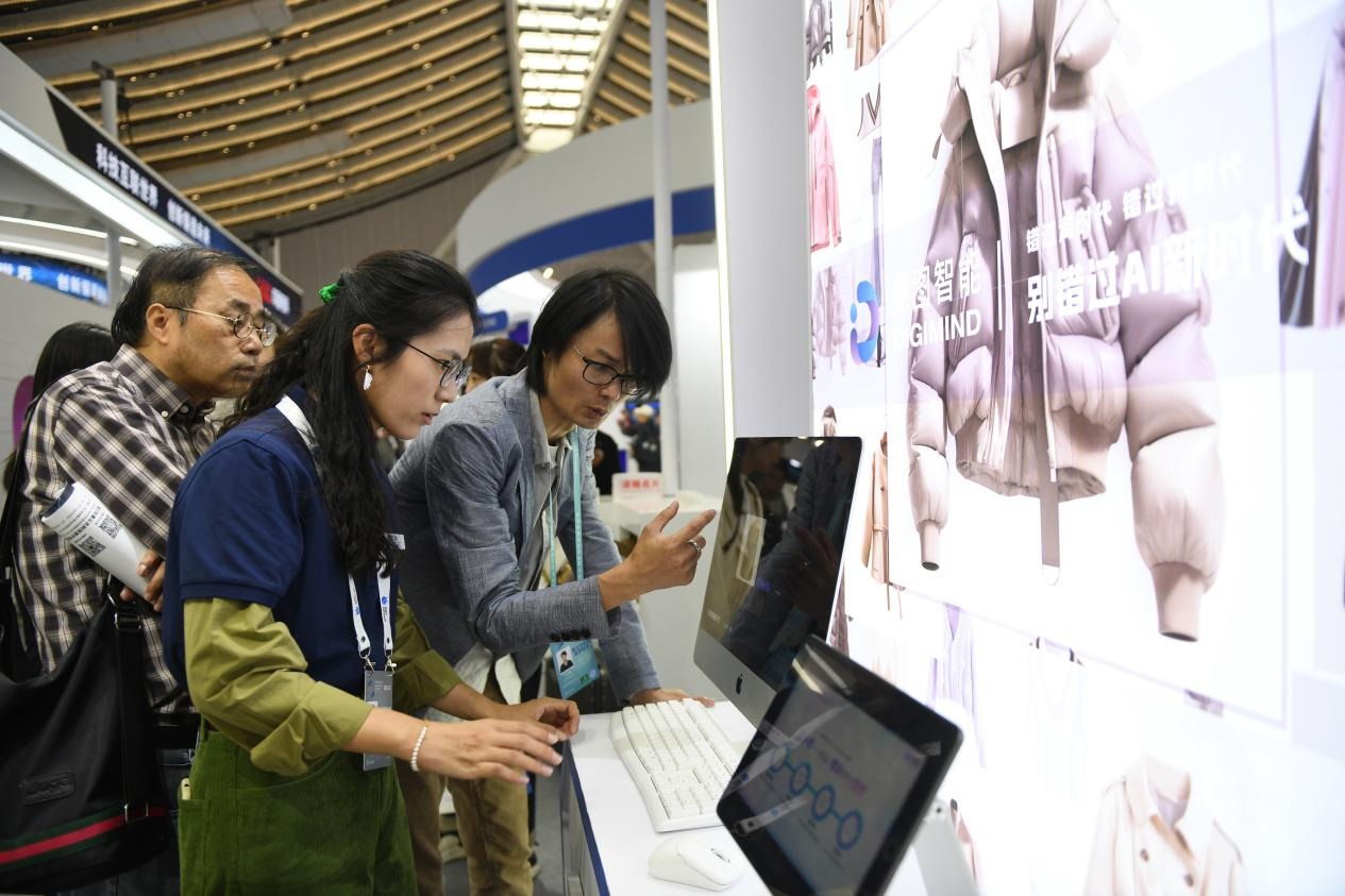△ 2023年11月9日,“互聯(lián)網(wǎng)之光”博覽會上,人工智能服裝設(shè)計技術(shù)吸引參觀者駐足體驗。