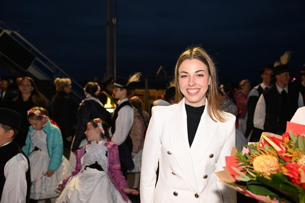 當?shù)貢r間5月8日晚,在匈牙利布達佩斯國際機場歡迎隊伍中的匈牙利姑娘歐拉·塔瑪拉。新華社記者謝環(huán)馳攝