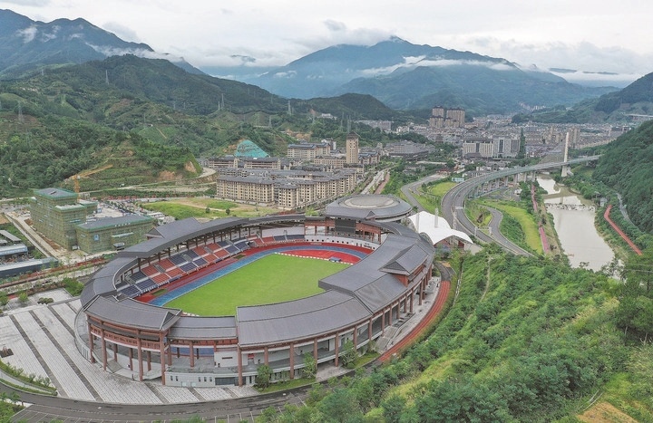 集籃球館、足球場、氣排球場、網(wǎng)球場等設(shè)施于一體的景寧體育公園。記者 林云龍 徐彥 葉錦霞 攝