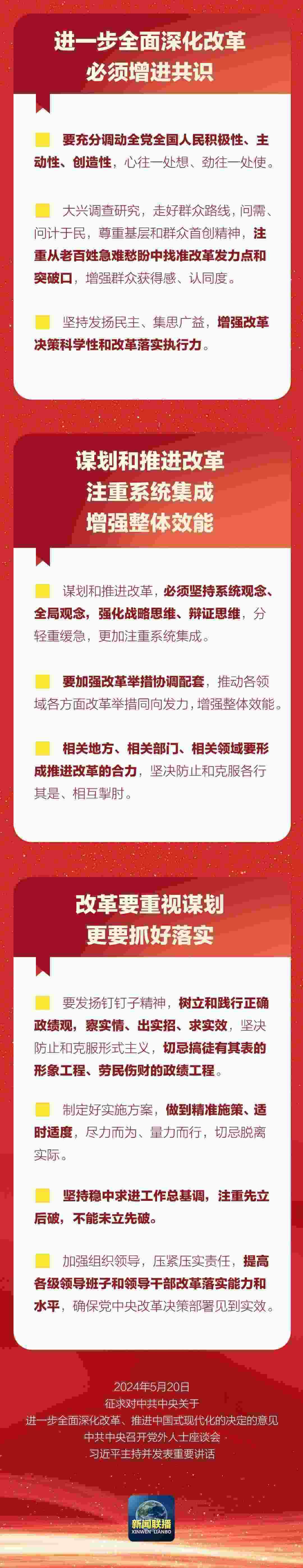 中共中央5月20日在中南海召開黨外人士座談會(huì),就中共中央關(guān)于進(jìn)一步全面深化改革、推進(jìn)中國式現(xiàn)代化的決定聽取各民主黨派中央、全國工商聯(lián)負(fù)責(zé)人和無黨派人士代表的意見建議。中共中央總書記習(xí)近平主持座談會(huì)并發(fā)表重要講話。