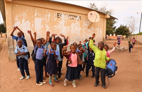 △2023年7月25日,莫桑比克馬普托省皮科科村學校的孩子們站在裝有中國援助的衛(wèi)星電視接收天線的房屋前。