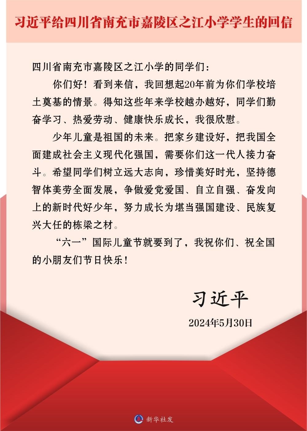 今年"六一"前夕,習(xí)近平總書記給之江小學(xué)的學(xué)生們回信:"得知這些年來學(xué)校越辦越好,同學(xué)們勤奮學(xué)習(xí)、熱愛勞動、健康快樂成長,我很欣慰。"他勉勵同學(xué)們爭做愛黨愛國、自立自強、奮發(fā)向上的新時代好少年,努力成長為堪當(dāng)強國建設(shè)、民族復(fù)興大任的棟梁之材。