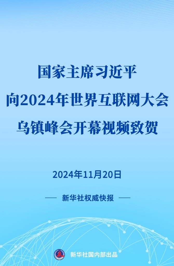 11月20日,國家主席習近平向2024年世界互聯(lián)網大會烏鎮(zhèn)峰會開幕視頻致賀。