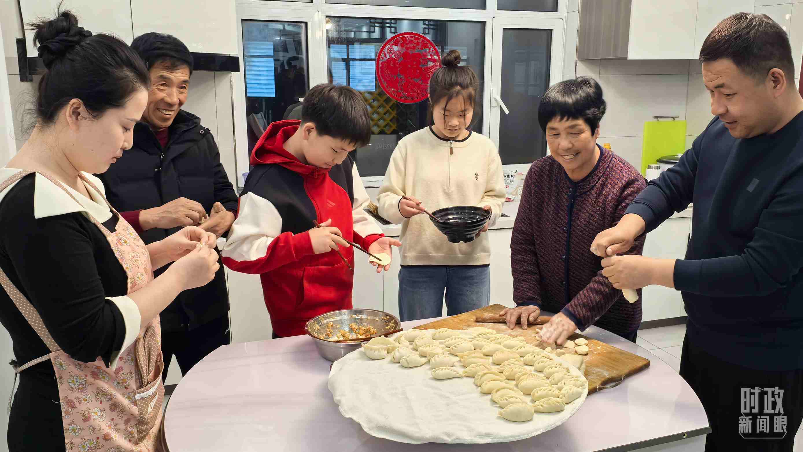 △王寶維一家正在包餃子。(總臺(tái)央視記者張垚拍攝)