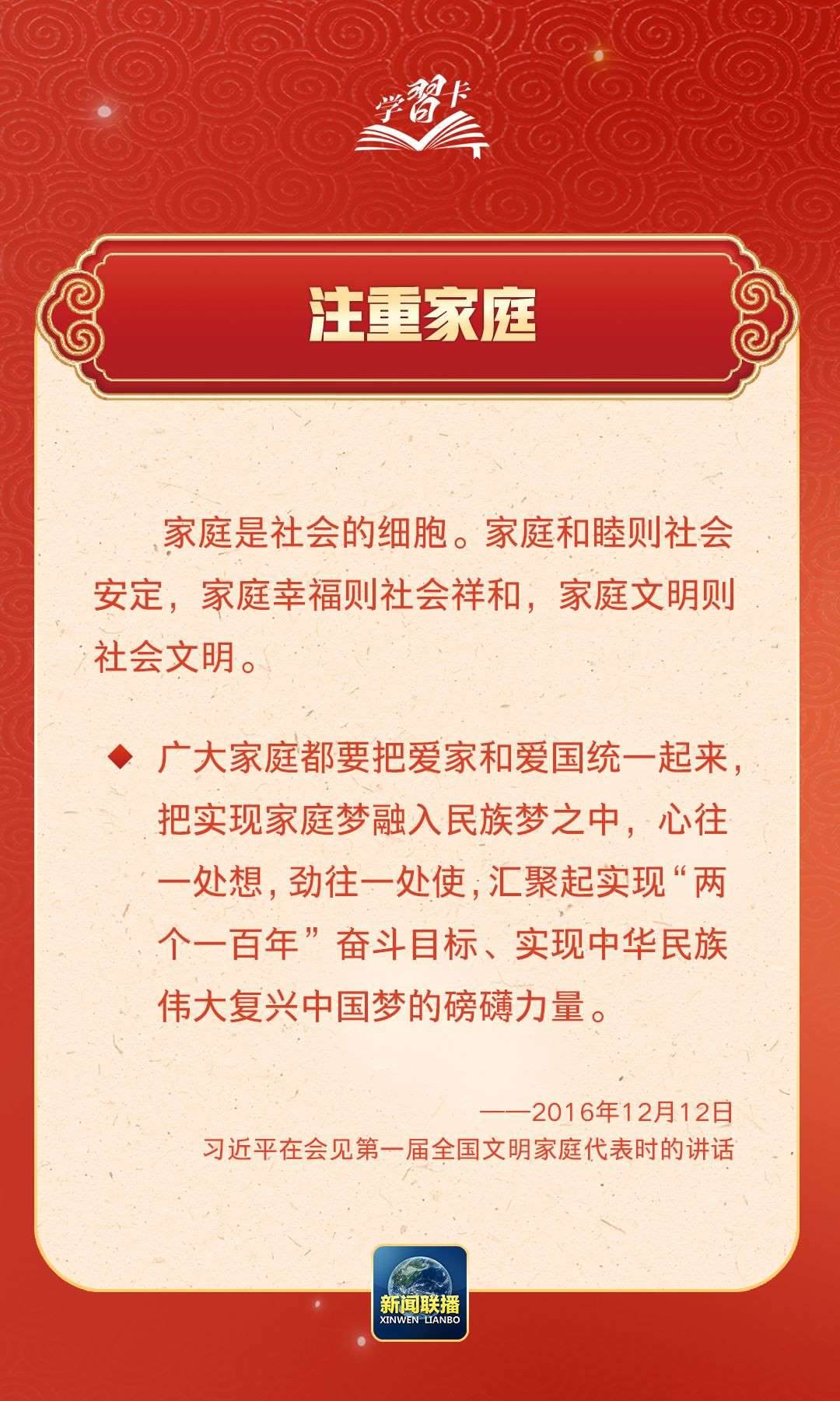 在習(xí)近平總書記心中,家國(guó)的分量很重。他多次強(qiáng)調(diào)要重視家庭建設(shè),提倡愛家愛國(guó)相統(tǒng)一,指出廣大家庭都要弘揚(yáng)優(yōu)良家風(fēng),以千千萬(wàn)萬(wàn)家庭的好家風(fēng)支撐起全社會(huì)的好風(fēng)氣。近日,《求是》雜志發(fā)表習(xí)近平總書記重要文章《注重家庭,注重家教,注重家風(fēng)》,一起學(xué)習(xí)↓