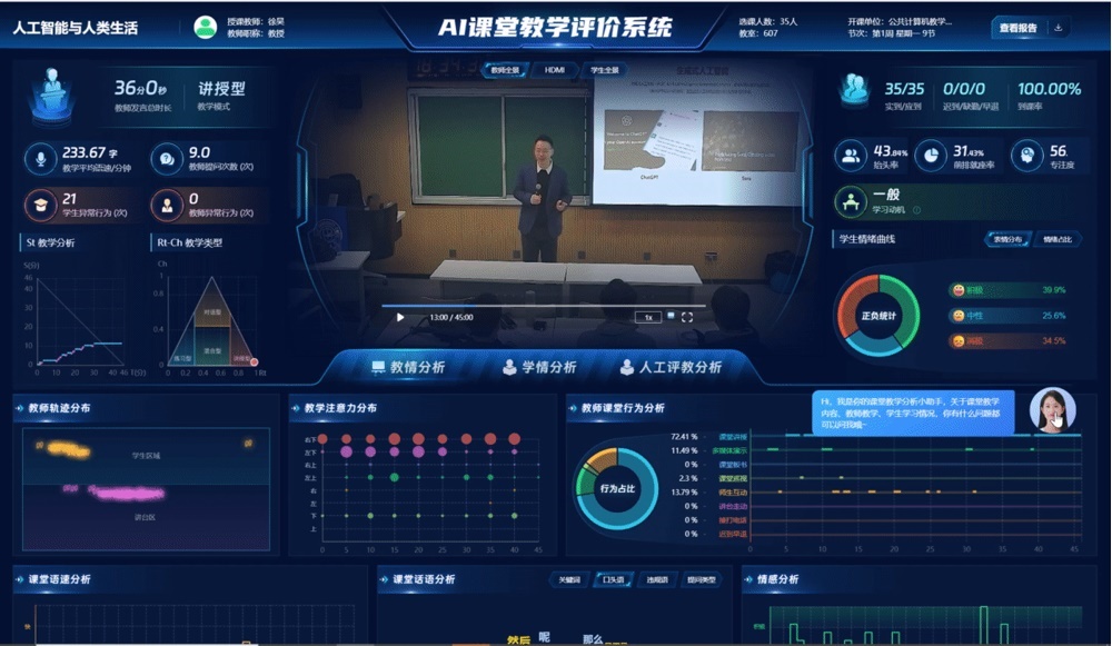 “您講授的‘人工智能與人類生活’課程質量很高,但您的口頭語比較頻繁……”報告共有教學內容、教學方法、師生行為等28項指標,還會針對提升教學質量給出合理建議。