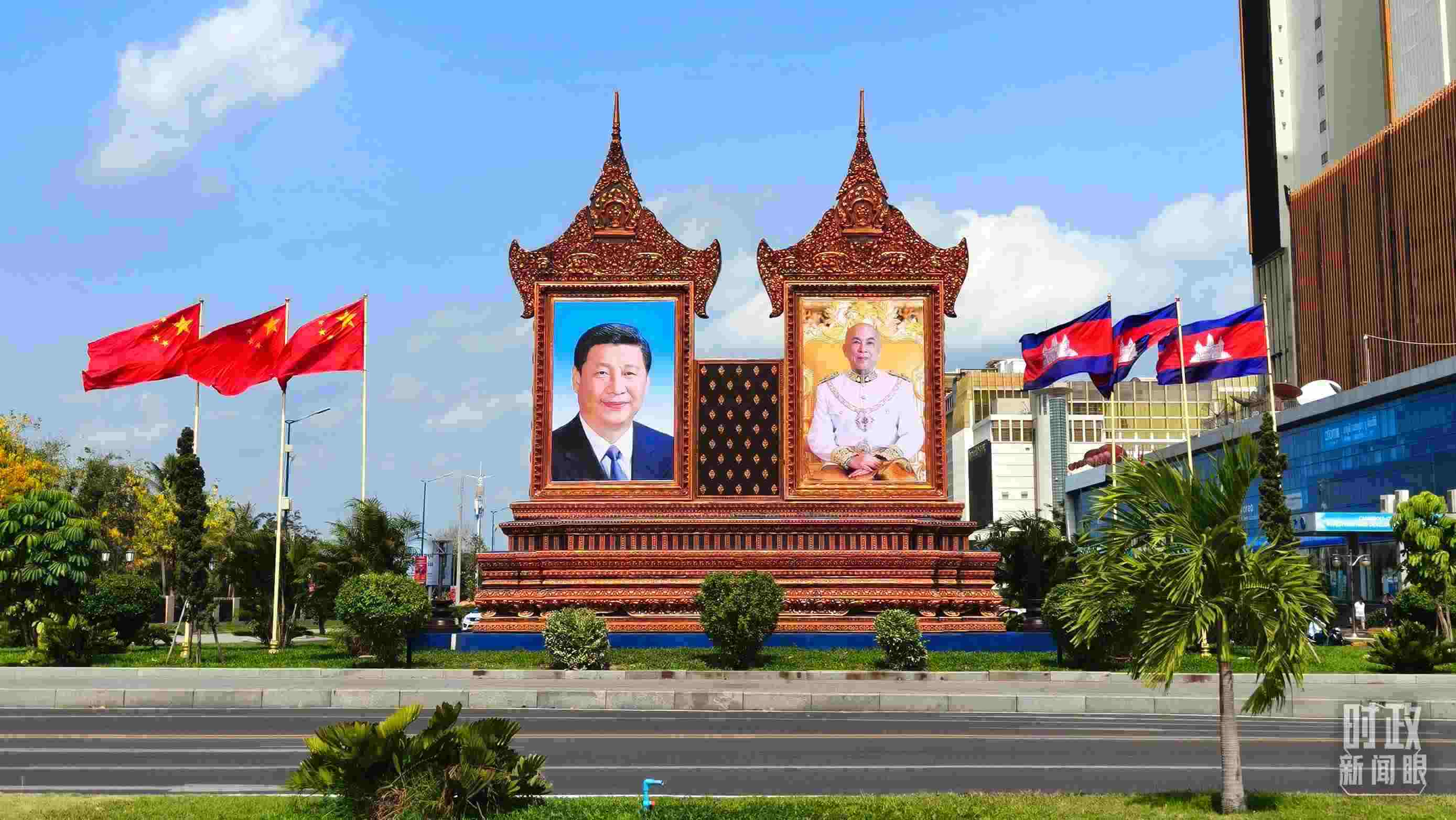 △金邊街頭的巨幅兩國領(lǐng)導人照片和兩國國旗。(總臺央視記者陸泓宇拍攝)