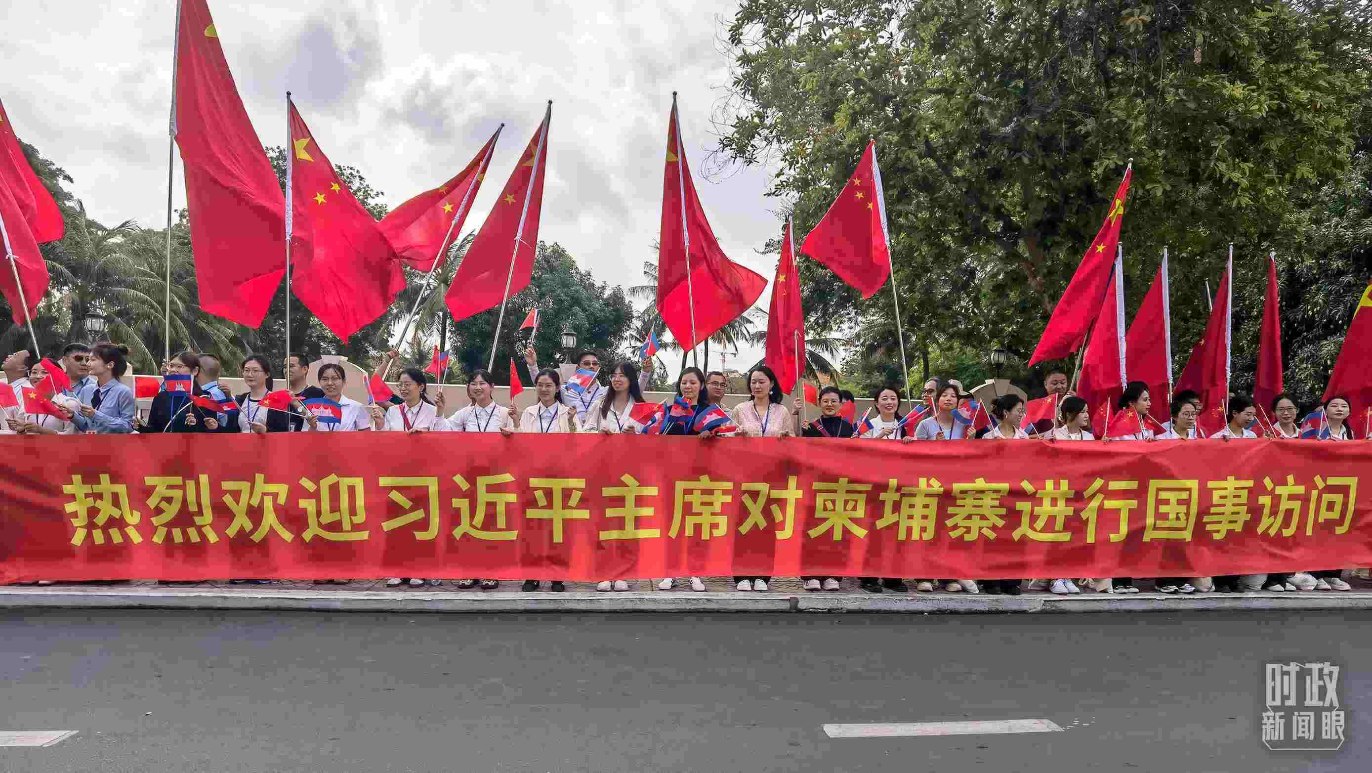 △金邊街頭的兩國國旗和標語。(總臺央視記者鄂介甫拍攝)