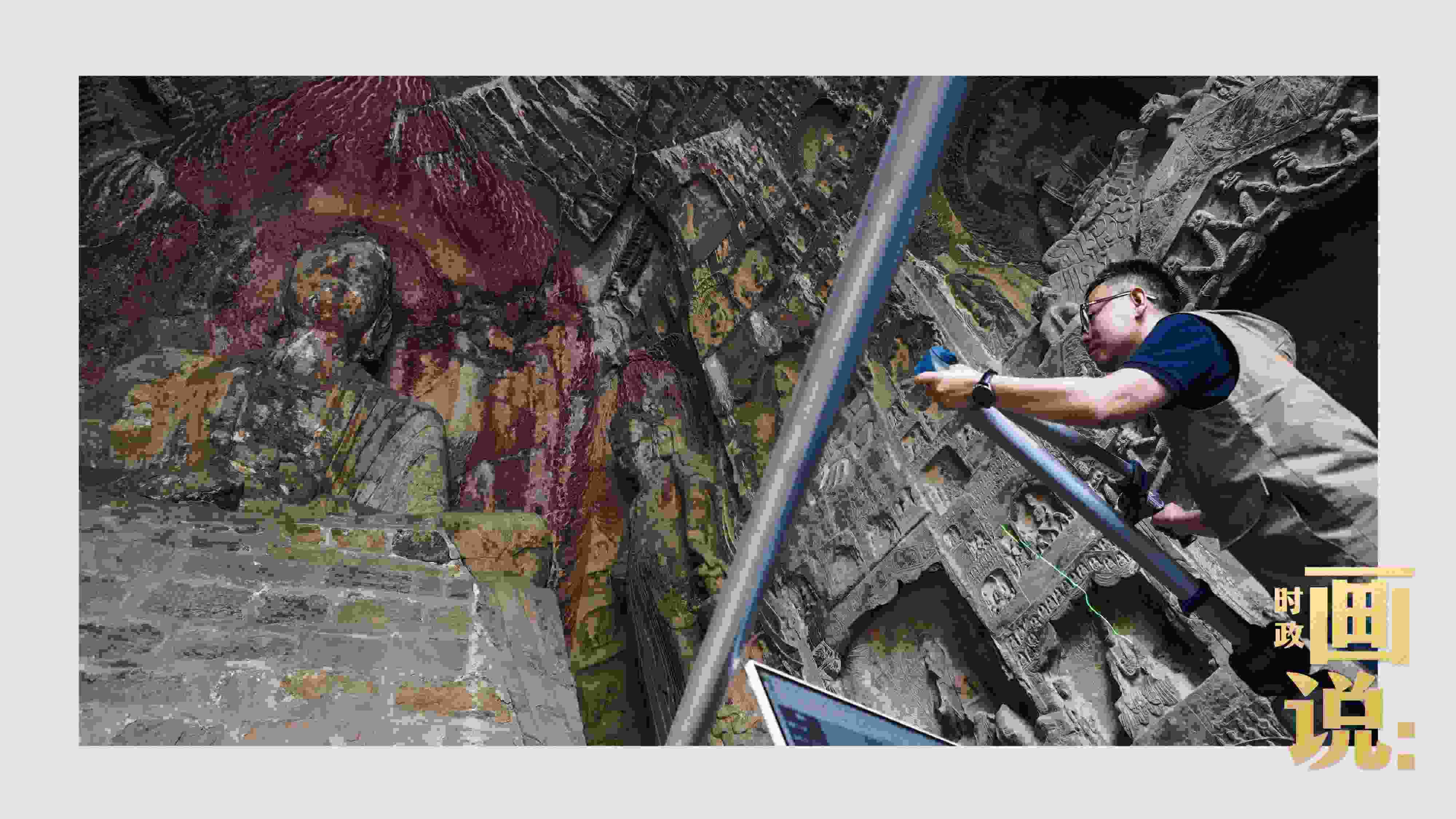 △龍門石窟研究院工作人員在古陽(yáng)洞使用關(guān)節(jié)臂掃描儀對(duì)佛像進(jìn)行數(shù)字化掃描