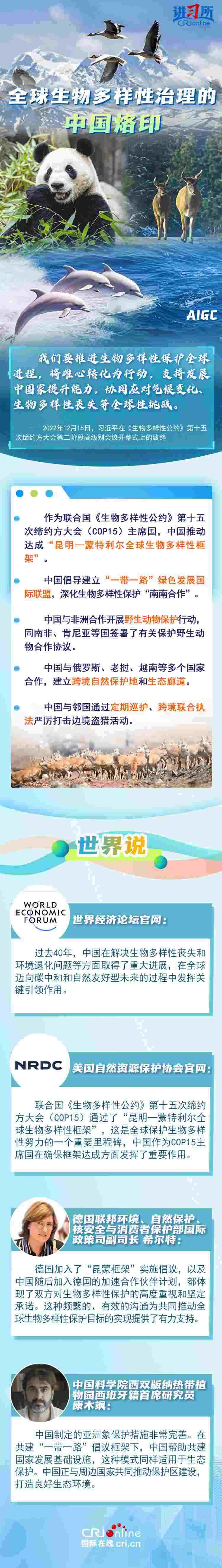 “心往一處想、勁往一處使,共建地球生命共同體?!弊鳛樽钤绾炇稹⑴鷾省渡锒鄻有怨s》的締約方之一,生物多樣性保護已經(jīng)上升為中國的國家發(fā)展戰(zhàn)略。國際人士表示,中國的一系列舉措體現(xiàn)出對生態(tài)環(huán)境保護的堅定決心,同時,中國依托共建“一帶一路”倡議等國際合作機制,為推動全球生物多樣性保護提供了有力支持,在邁向自然友好型未來的過程中發(fā)揮關鍵的引領作用。