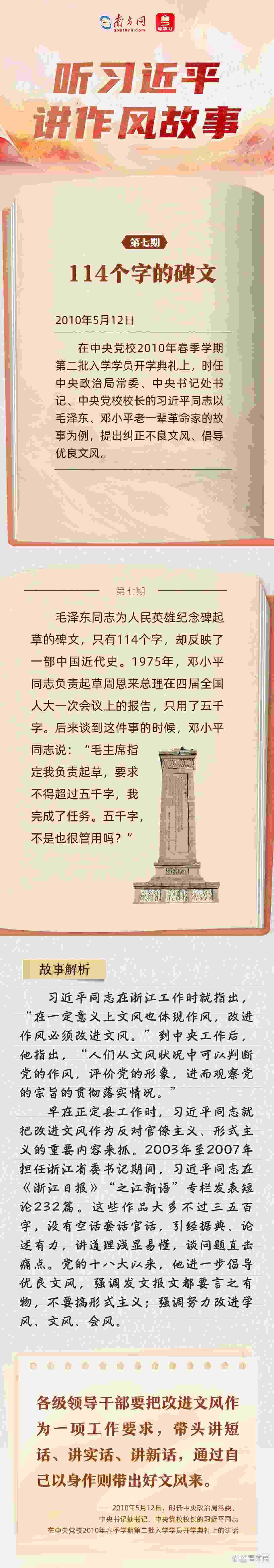 當前,全黨上下正在開展深入貫徹中央八項規(guī)定精神學(xué)習(xí)教育,縱深推進作風(fēng)建設(shè)。關(guān)于作風(fēng)建設(shè),習(xí)近平總書記常用講故事的方式,傳達深意、感染他人,給人以思想啟迪。南方網(wǎng)、粵學(xué)習(xí)客戶端推出“聽習(xí)近平講作風(fēng)故事”系列報道,與您一起感悟這些故事蘊含的深刻道理。 今天,推出《聽習(xí)近平講作風(fēng)故事⑦丨114個字的碑文》,與您一起學(xué)習(xí)毛澤東、鄧小平老一輩革命家的文風(fēng)。
