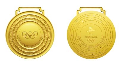 北京冬奧會(huì)金牌正面(左)與背面 新華社發(fā)(北京冬奧組委供圖)