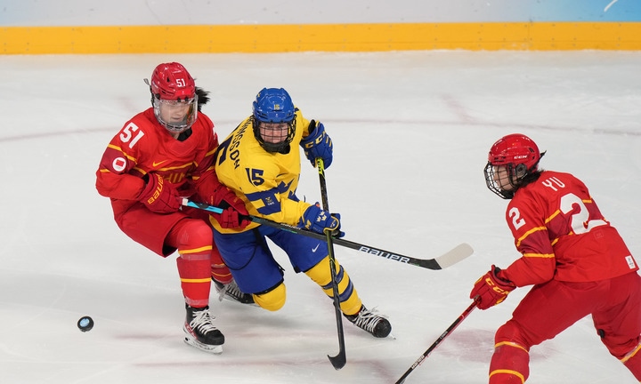 2月7日,中國(guó)隊(duì)球員張喜芳(左)與瑞典隊(duì)球員莉薩·約翰松(中)在比賽中拼搶。新華社記者孟永民攝