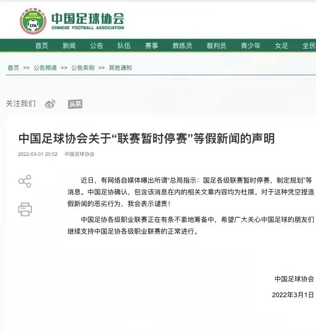 “近日,有網(wǎng)絡自媒體曝出所謂‘(體育)總局指示:國足各級聯(lián)賽暫時停賽,制定規(guī)劃’等消息。中國足協(xié)確認,包含該消息在內(nèi)的相關文章內(nèi)容均為杜撰。對于這種憑空捏造假新聞的惡劣行為,我會表示譴責!”中國足協(xié)在聲明中說。