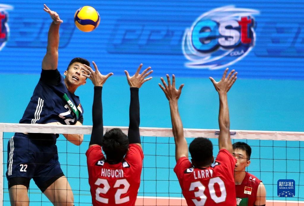8月14日,中國(guó)隊(duì)球員張景胤(左一)在比賽中扣球。新華社記者 王騰 攝
