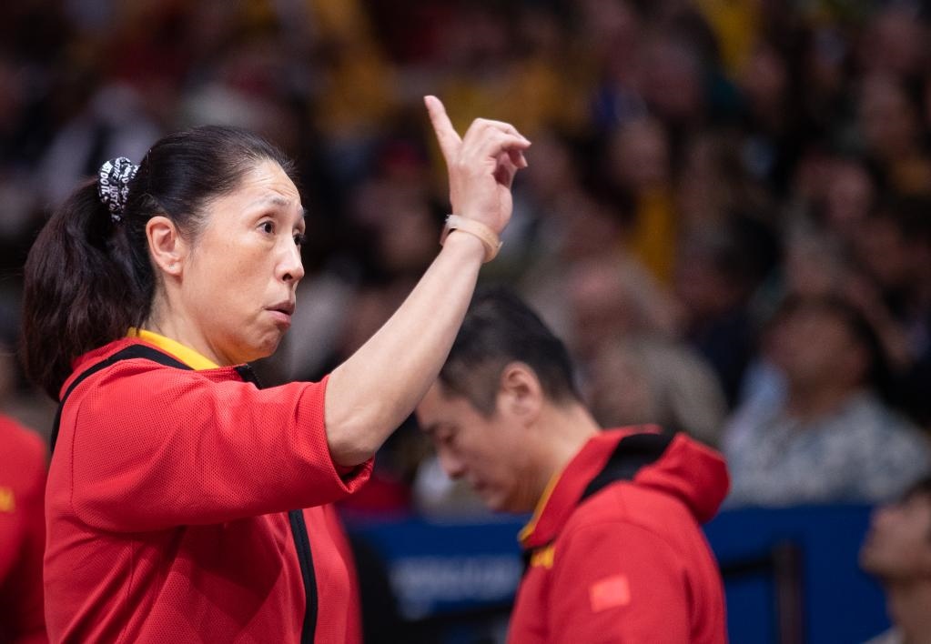 10月1日,中國(guó)隊(duì)主教練鄭薇(前)在比賽中指揮。新華社發(fā)(胡涇辰攝)