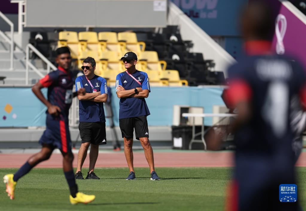 11月18日,國(guó)際足聯(lián)裁判委員會(huì)主席皮耶路易吉·科利納(下)觀看訓(xùn)練。新華社記者 賈浩成 攝