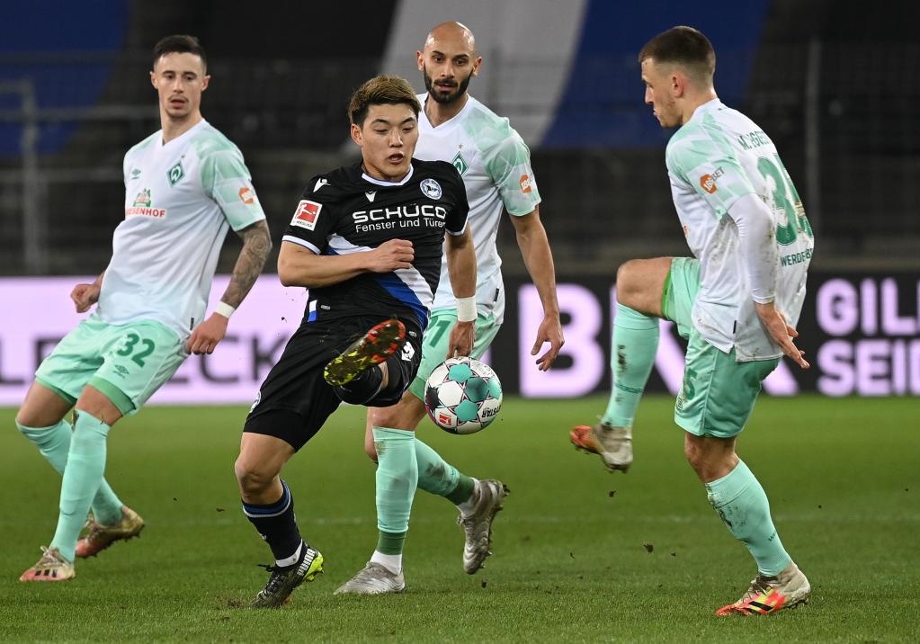 2021年3月10日,當(dāng)時效力于比勒菲爾德隊的日本球員堂安律(前左)在德甲比賽中帶球突破。他現(xiàn)在效力于德甲弗賴堡俱樂部。新華社發(fā)(烏爾里?!ず蚣{格爾 攝)
