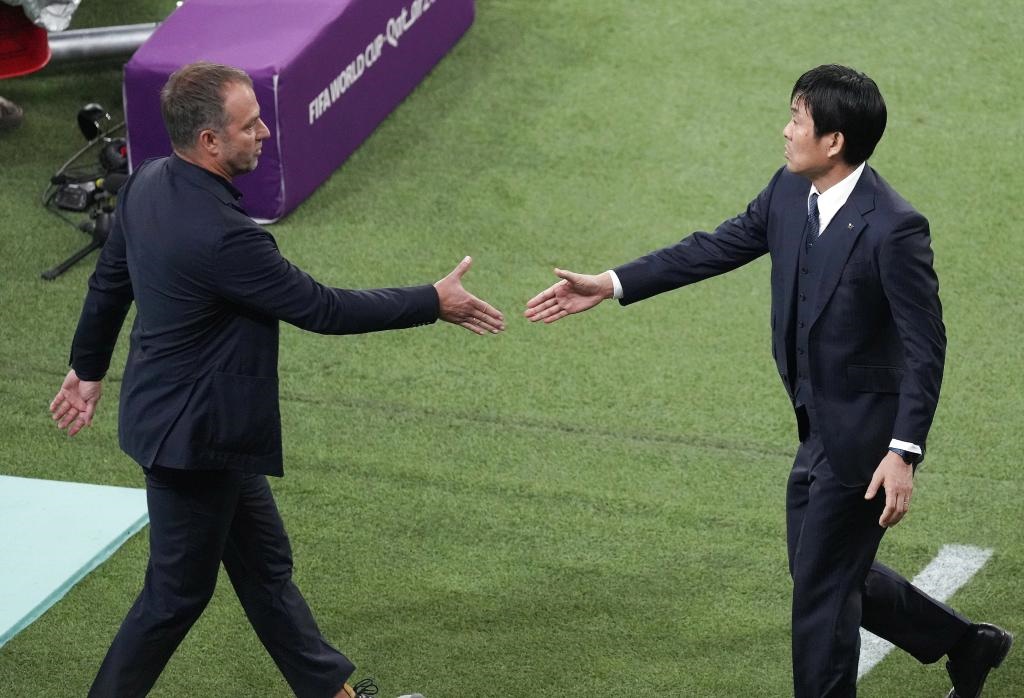 11月23日,德國隊主教練弗利克(左)與日本隊主教練森保一在賽后握手。新華社記者陳誠攝