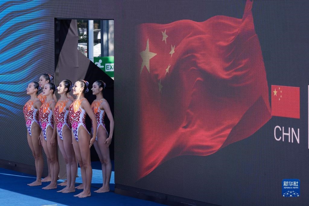 這是2022年6月24日,中國隊在游泳世錦賽花樣游泳集體自由自選決賽前入場。新華社記者 孟鼎博 攝