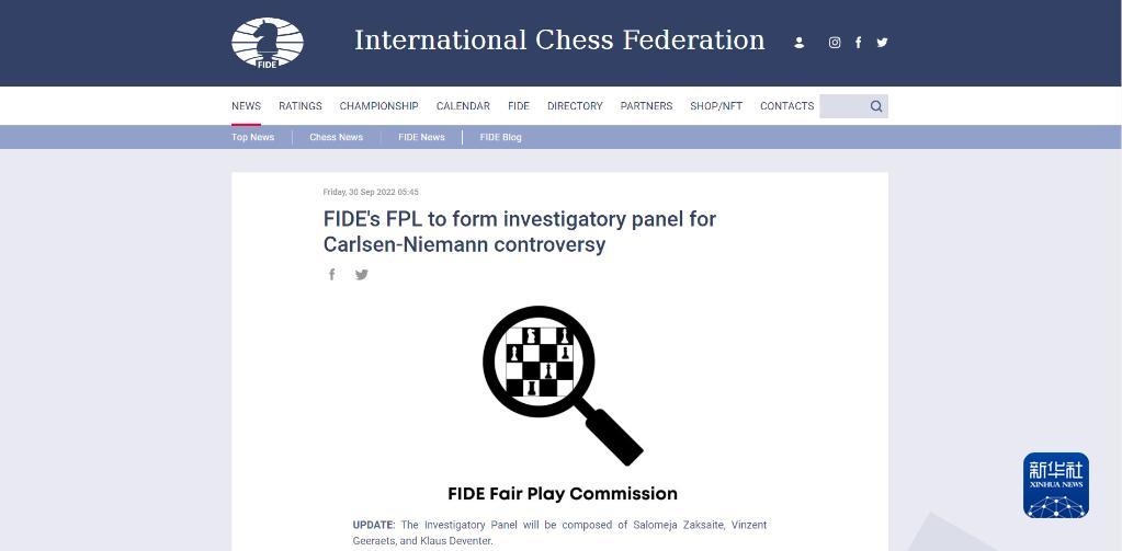 這是國際棋聯(lián)2022年9月30日在官網(wǎng)公布的關(guān)于作弊風波,決定成立調(diào)查小組的新聞頁面。新華社發(fā)