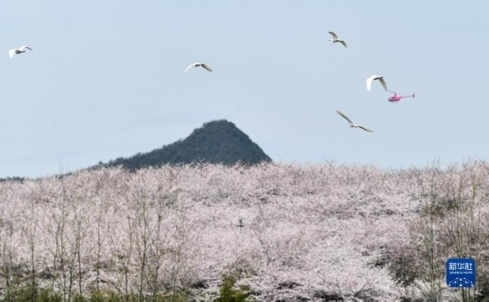 3月21日,一群鳥在貴州省貴安新區(qū)櫻花園內飛翔。