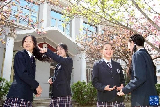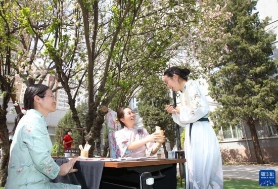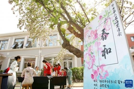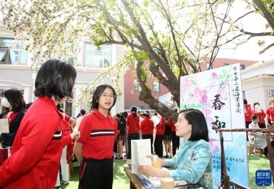當(dāng)日,北師大實驗華夏女子中學(xué)舉辦以“春和”為主題的第二屆“海棠詩會”。師生們選取有關(guān)“春天”“和煦”“生機”“美好”的詩歌,在校園的海棠樹下賞析吟誦,共享詩歌之美,傳承中華優(yōu)秀傳統(tǒng)文化。