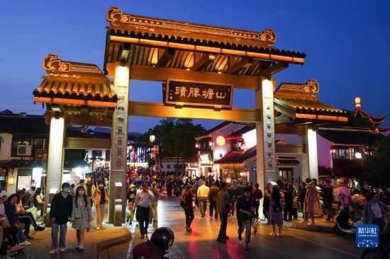 游客在江蘇蘇州山塘街休閑游玩(4月10日攝,無人機(jī)照片)。