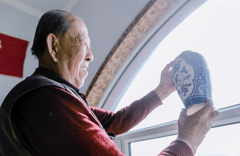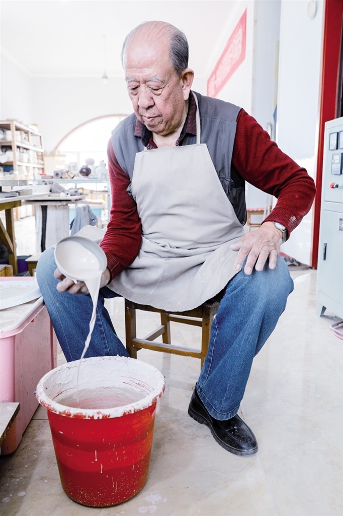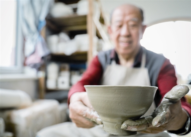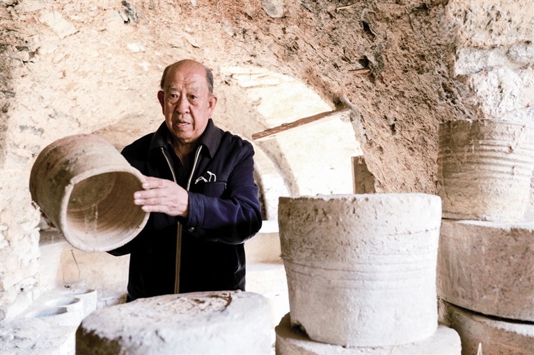 隨后,他走進“饅頭窯”旁邊的一口窯洞,這是當時張家的一間手工作坊,揉泥、拉坯、上釉等一系列制作陶瓷的工序都是在這里完成?!拔揖统錾谶@個村子,已經(jīng)是張家瓷藝的第九代傳人了。作為中國磁州窯譜系,清水河黑礬溝瓷藝生產(chǎn)歷史至少已有800年。”關(guān)于這項非遺的歷史故事,張選老人向記者娓娓道來:大約400年前,他們張家走西口從山西來到清水河謀生,當時清水河黑礬溝有一家姓杜的人家做陶瓷營生,張家的先人在杜家打工,大概這樣打工做了三輩人吧,杜家忽然不做了,搬離了黑礬溝,他們張家便把杜家的產(chǎn)業(yè)買了下來繼續(xù)做?!澳莻€時候黑礬溝生產(chǎn)的瓷器都與人們生活息息相關(guān),比如腌菜缸、水甕、碗盤等,一個家庭手工作坊一天能生產(chǎn)500個碗呢,生意很好,人們靠做這個營生也過上了不錯的生活?!睆堖x回憶著清水河瓷藝鼎盛時期的場景。上個世紀70年代,由于交通、技術(shù)等原因,黑礬溝燃燒了幾百年的窯火熄滅,傳統(tǒng)“饅頭窯”被正式廢棄,轉(zhuǎn)移到窯溝鄉(xiāng)后手工作坊變成了機械化生產(chǎn),這也讓清水河的陶瓷名聲大噪。當時,在窯溝鄉(xiāng)一帶,從事陶瓷生產(chǎn)的有近萬人,陶瓷業(yè)成為清水河支柱產(chǎn)業(yè)。
