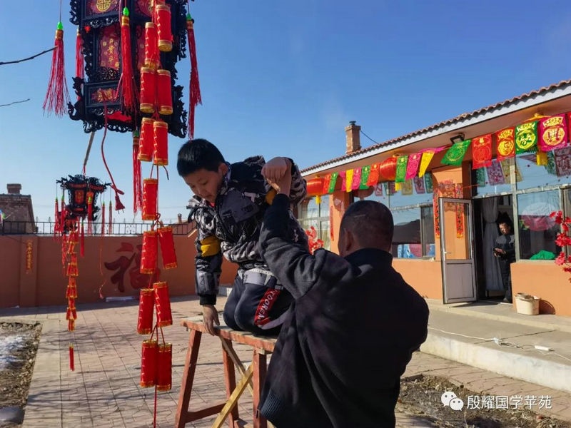 父親讓曈曈接地氣的愿望實現了,長得越來越壯實的曈曈真是打心眼喜歡上了農村,喜歡看叔叔大爺們是如何勞動的。春天澆地的時候,他跟上我的發(fā)小利利到地里去,手里拿上一張鐵鍬學著去攏堰堤;秋收的時候他爬上了丁補元駕駛的收割機,感受農民們收割玉米的喜悅;接羔的時候,他又鉆進利軍家的羊群里,抱著出生沒有幾天的小羊羔,給小羊羔喂牛奶……春節(jié)前的一兩天是他最忙的時候:一會跟上大爹貼春聯(lián),一會跟上茹義大爺掛紅燈,忙得不亦樂乎。前一段時間回村里他又要跟上利軍大爺出村放羊去,又要跟上茹義大爺去種玉米,在城里他是見識不到這些的。