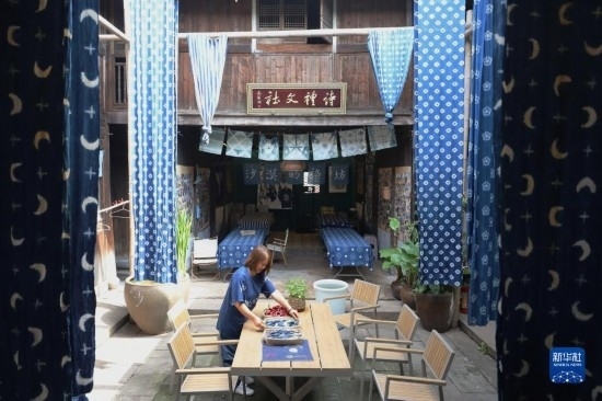 5月23日,在浙江省義烏市李祖村,“沙漠的染坊”主理人的母親在店內(nèi)整理桌面。