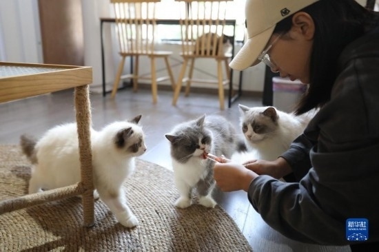 5月23日,在浙江省義烏市李祖村,貓咖“貓的小院”店長在開店前給貓喂零食。