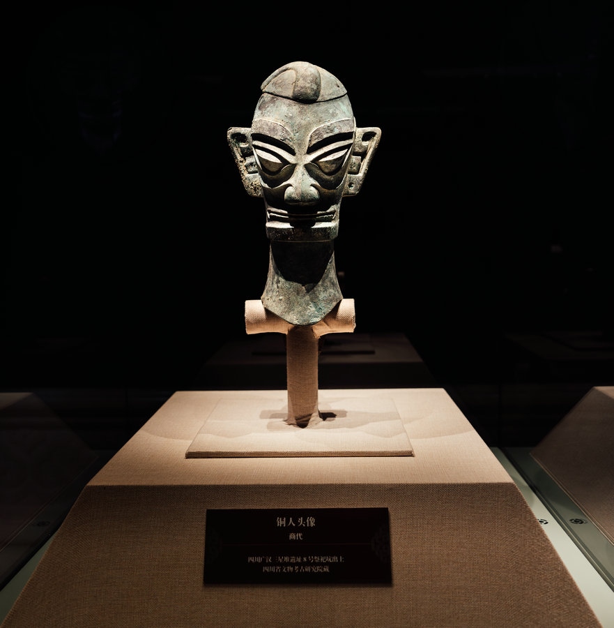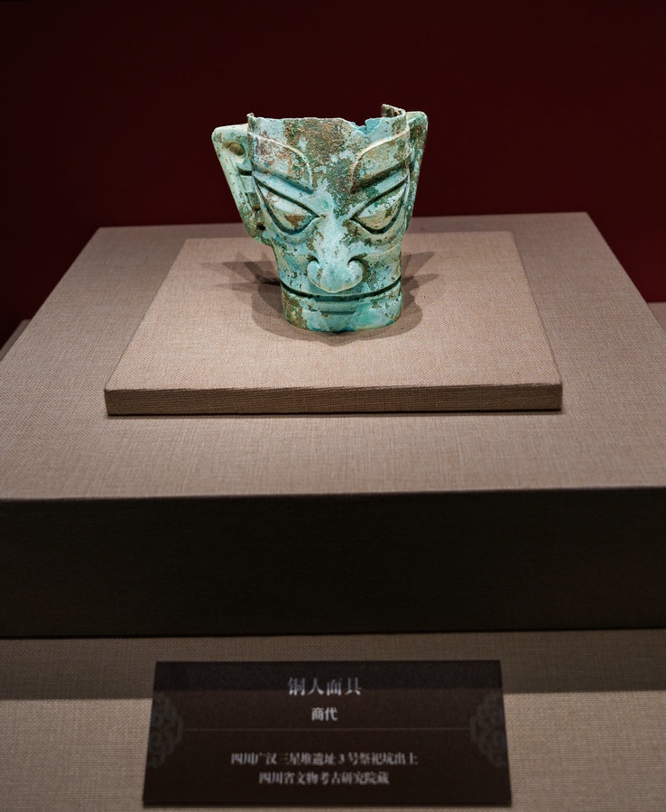 來自四川廣漢三星堆遺址出土的文物引人關(guān)注,三星堆展品共5件,銅人頭像、銅人面具、銅頂尊跪坐人像肩部龍形裝飾、銅跪坐人像4件真品,銅縱目面具1件復(fù)制品。