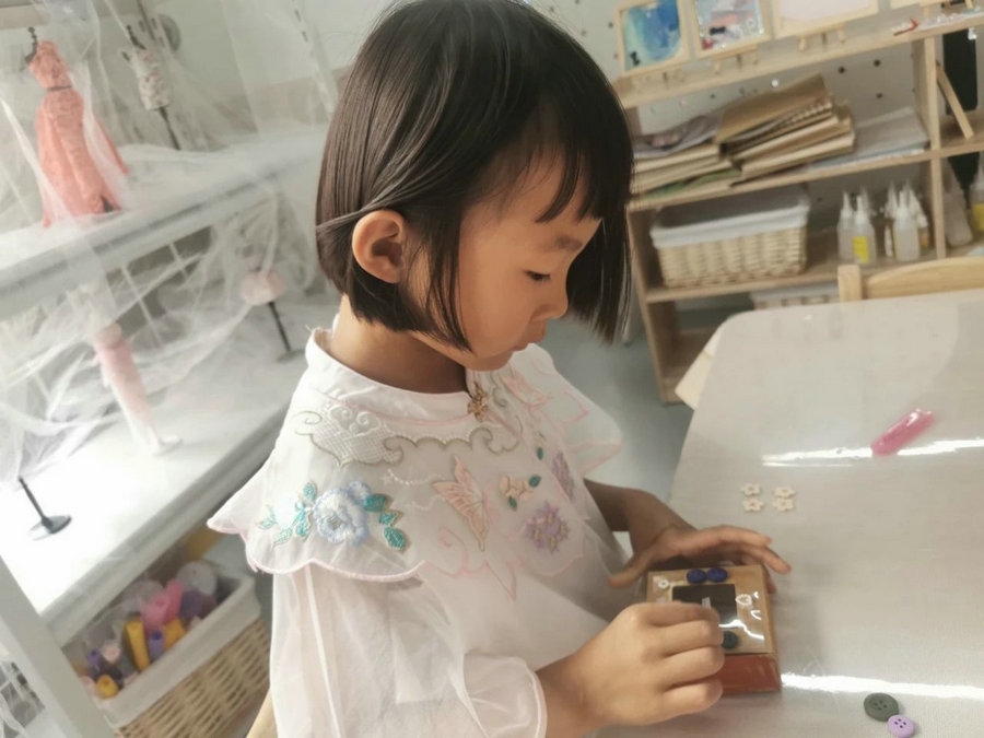 在布衣樣區(qū)域,小朋友親自制作艾草手工皂,通過(guò)繪畫(huà)艾草圖標(biāo)設(shè)計(jì)禮盒、制作艾草工皂,用做好的艾草洗手,感受成果的喜悅。(記者 楊凈毓)