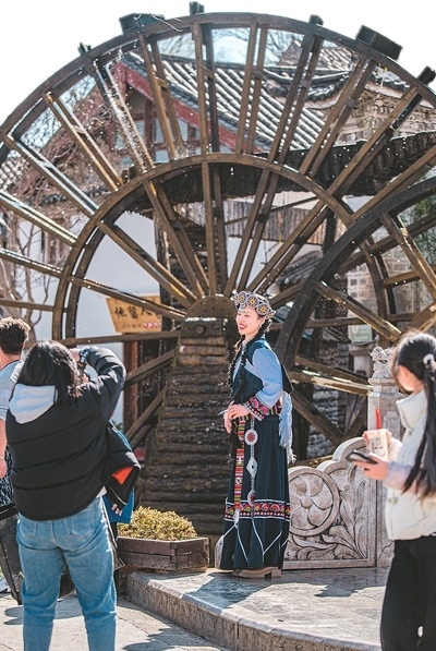 游客在云南麗江古城身穿納西族服飾拍照留念。和珍浩攝