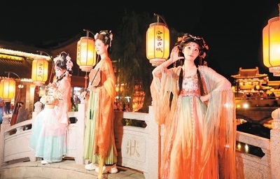游客身穿漢服在河南洛邑古城夜游打卡。洛邑古城供圖