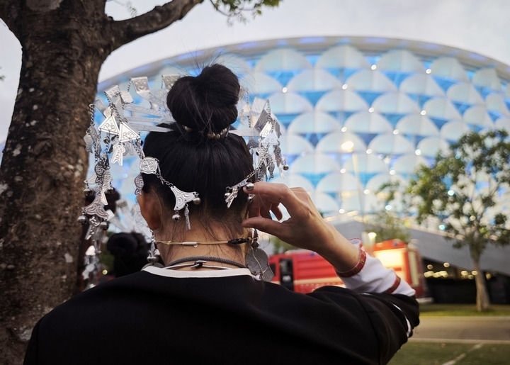 2024年11月20日,一名女子在三亞市體育中心場(chǎng)館外整理頭飾。新華社記者 李尕 攝